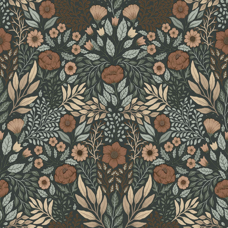 Dette stemningsfulde tapet bringer varme og dybde ind i hjemmet med sit detaljerede botaniske mønster i brune, beige og grønne nuancer. Tapetet udstråler ro og naturinspiration, hvilket gør det ideelt til soveværelser, stuer eller spisestuer, hvor du ønsker en hyggelig og sofistikeret atmosfære. Det klassiske blomstermotiv kombineret med jordnære farver giver rummet en elegant balance mellem vintage og moderne stil.