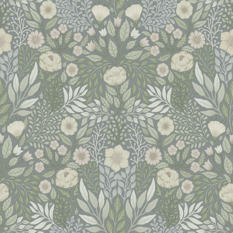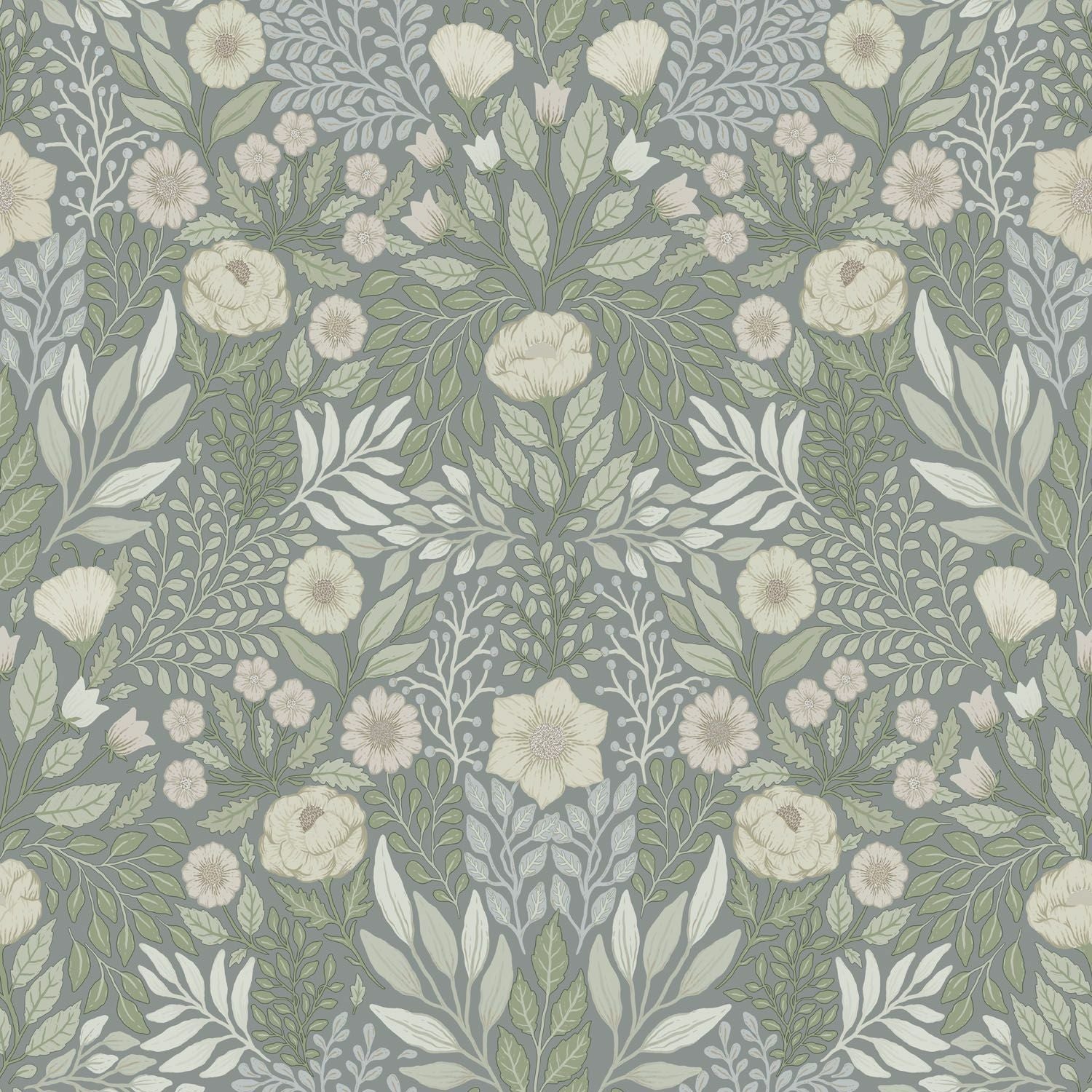 Et botanisk tapet fyldt med detaljerede blomster og blade i afdæmpede grønne og grå nuancer. Mønstret skaber en harmonisk balance mellem klassisk elegance og naturlig friskhed – perfekt til både stue, soveværelse og børneværelse. De rolige farver giver en følelse af ro, mens det frodige motiv tilføjer dybde og liv til væggen.