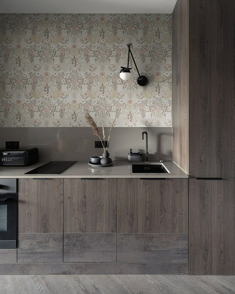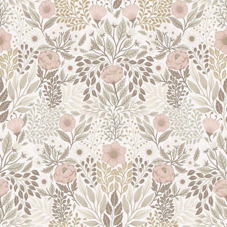 Dette smukke tapet forener klassisk romantik med moderne farver. Det detaljerede blomstermønster i lyserøde, beige og brune nuancer giver væggen liv og varme uden at virke dominerende. Det botaniske design skaber en rolig og harmonisk atmosfære, som passer perfekt til både køkken, stue og soveværelse.