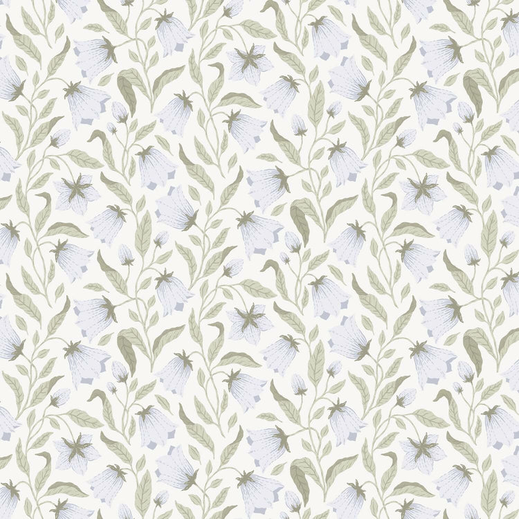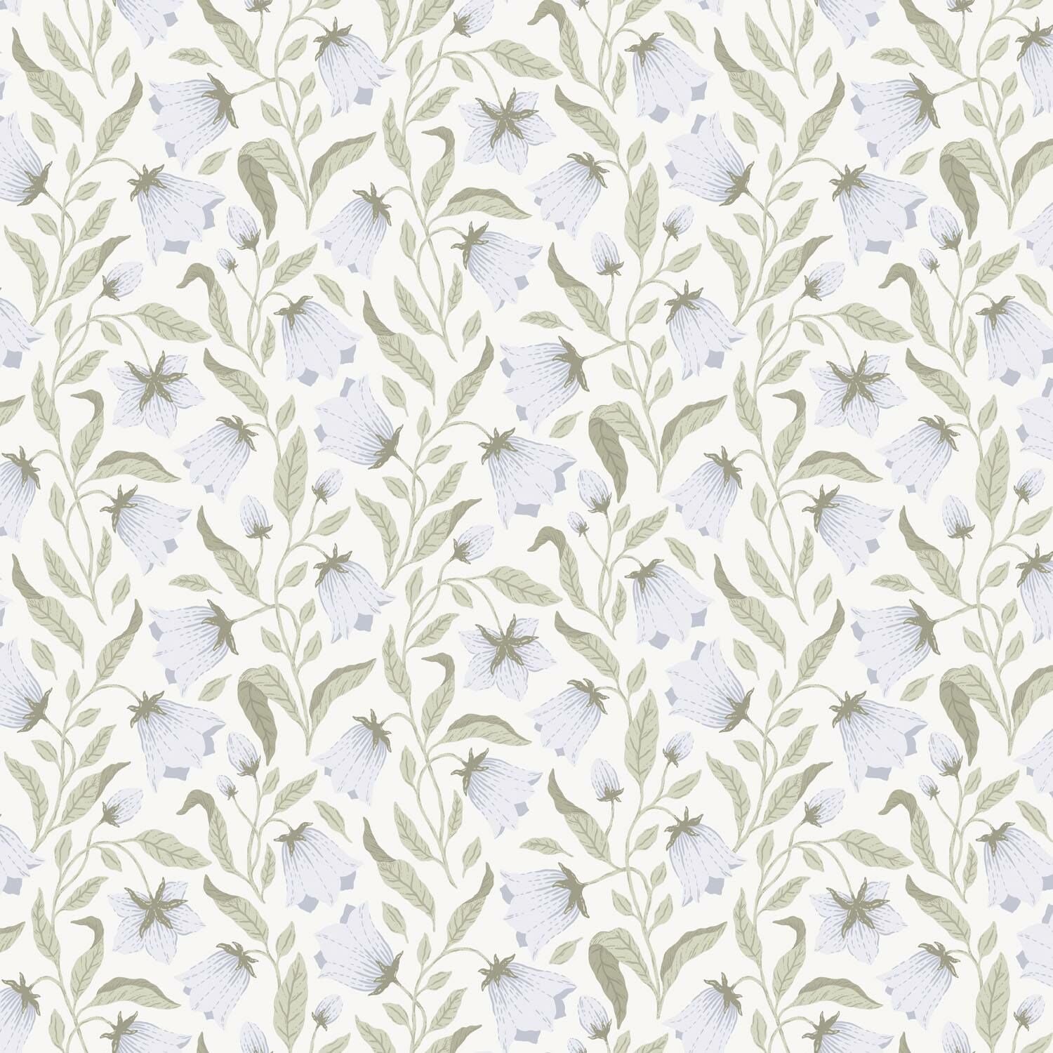 Et elegant tapet med et let og luftigt blomstermønster i afdæmpede grønne og blå toner. De fine klokkeblomster snor sig harmonisk hen over overfladen og skaber en rolig og naturlig atmosfære. Tapetet passer perfekt til soveværelset, stuen eller køkkenet, hvor du ønsker et frisk og samtidig tidløst udtryk.