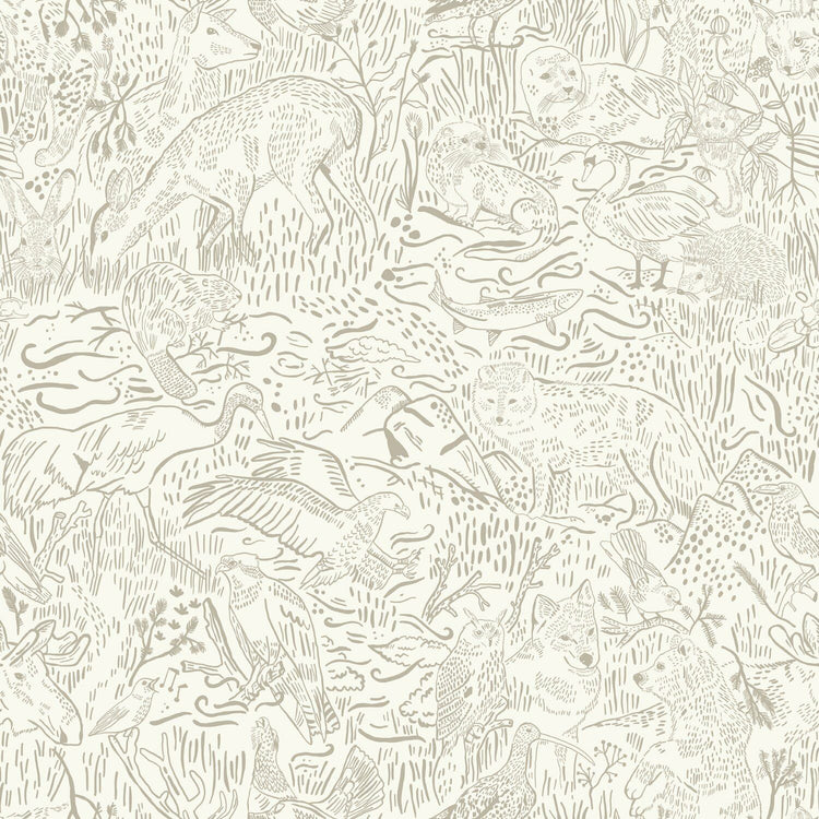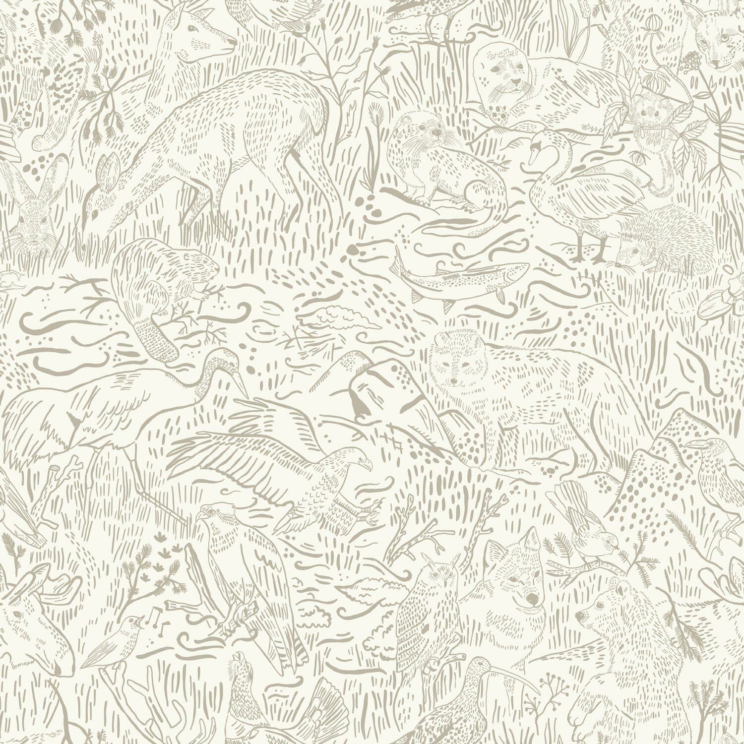 Et unikt tapet med et detaljeret naturmønster, der viser skovens dyr og planter i et elegant, håndtegnet udtryk. De rolige beige nuancer giver tapetet et moderne og afdæmpet look, som passer perfekt i alt fra køkken og entre til børneværelse eller kontor. Designet forener naturens ro med et kunstnerisk strejf – en subtil måde at tilføre liv og struktur til væggen.