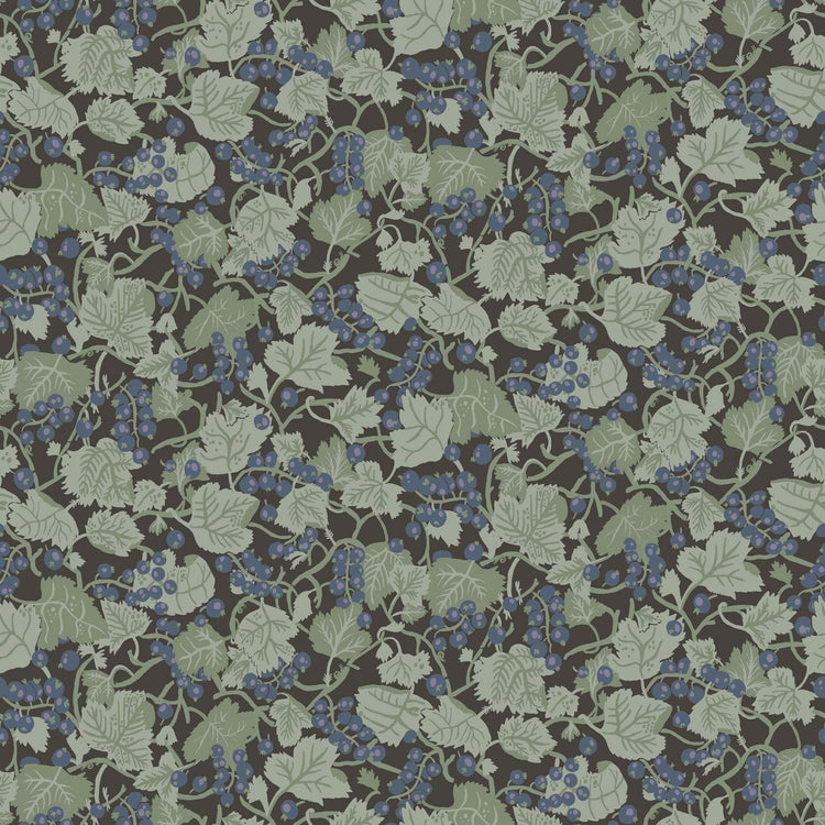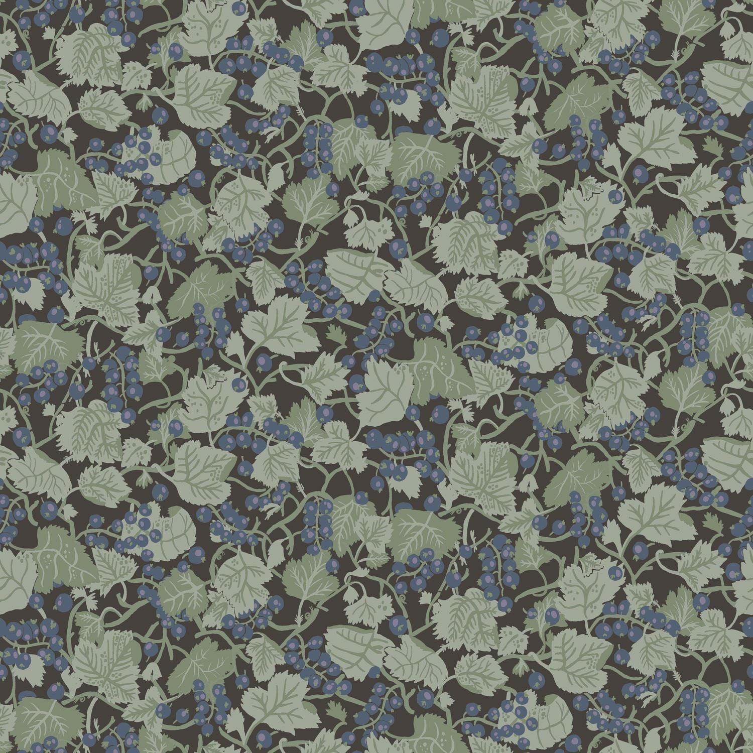 Et stemningsfuldt tapet med dybde og karakter – her slynger grønne blade og blå bær sig elegant på en mørk baggrund. Mønstret giver en sofistikeret og naturlig atmosfære, perfekt til stue, spisestue eller køkken, hvor du ønsker en kombination af natur og moderne design.
